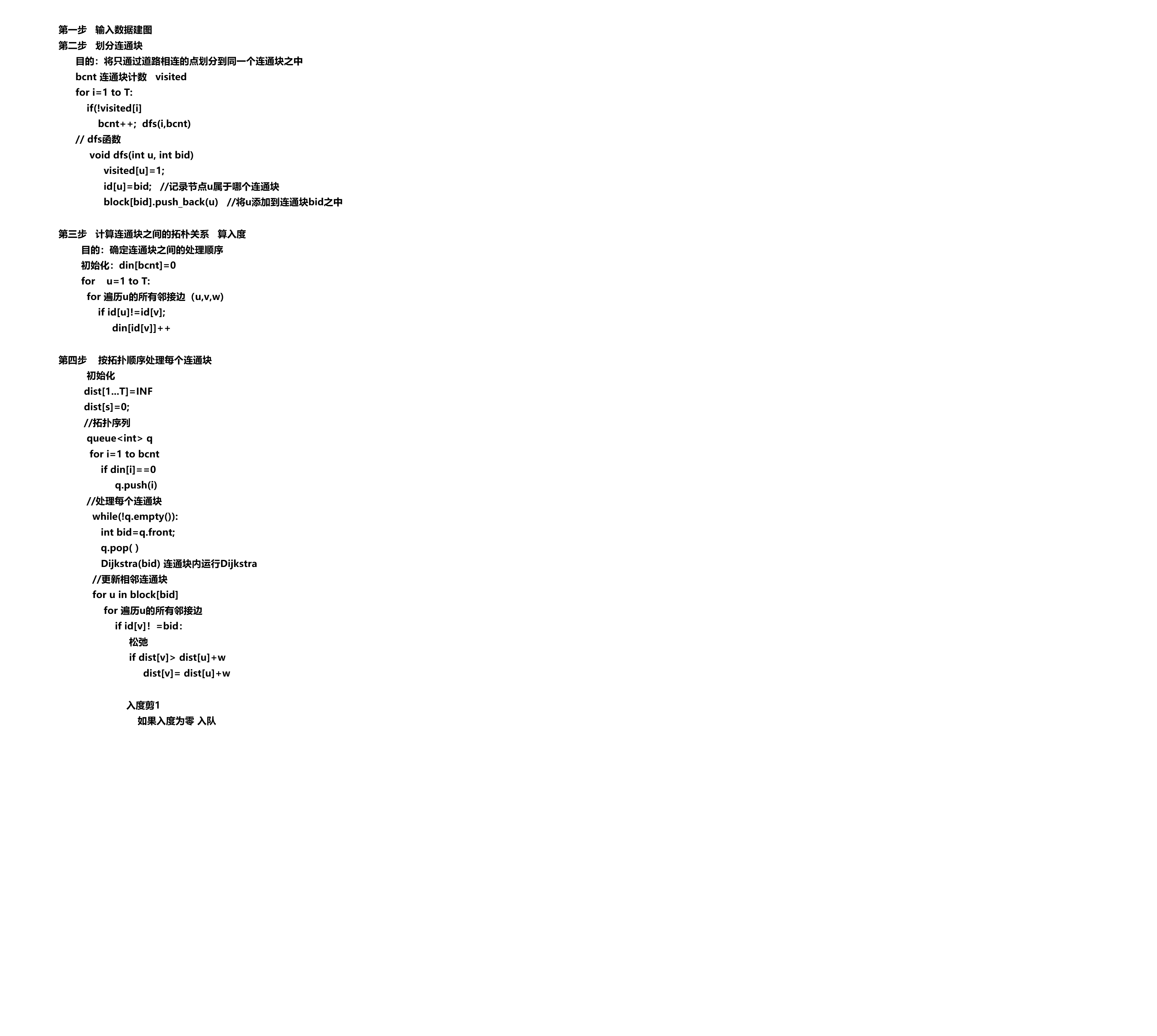 topsort+dijkstra#include<bits/stdc++.h> using namespace std; typedef pair<int, int> PII; // 定义pair类型别名,方便使用 const int N = 25010; // 最大城镇数量 const int INF = 0x3f3f3f3f; // 定义无穷大值(约10^9) int T, R, P, S; // 城镇数量,道路数量,航线数量,起点 // 使用vector实现邻接表存储图结构 // graph[u] 是一个vector,存储从节点u出发的所有边 // 每条边是一个pair:(目标节点v, 边的权重w) vector<vector<PII> > graph; // dist数组:存储从起点S到每个节点的最短距离 int dist[N]; // st数组:在Dijkstra算法中标记节点是否已确定最短路径 bool st[N]; // -------------------- 连通块相关数据结构 ------------------------------------------------------------------------------------------------------------------------------ // block[i]:存储第i个连通块中的所有节点编号 vector<int> block[N]; // id[u]:记录节点u属于哪个连通块 int id[N]; // bcnt:连通块的数量计数器 int bcnt; // visited数组:在DFS中标记节点是否已访问 bool visited[N]; // -------------------- 拓扑排序相关数据结构 ---------------------------------------------------------------------------------------------------------------------------- // din[i]:存储第i个连通块的入度(有多少条航线指向这个连通块) int din[N]; // 函数:添加一条从a到b的有向边,权重为c void add(int a, int b, int c) { // 将边(a,b)加入邻接表,权重为c graph[a].push_back(make_pair(b, c)); } // 函数:使用DFS划分连通块(只遍历道路) // 参数:u-当前节点,bid-当前连通块的编号 void dfs(int u, int bid) { // 标记当前节点已访问 visited[u] = true; // 记录当前节点属于连通块bid id[u] = bid; // 将当前节点添加到连通块bid的节点列表中 block[bid].push_back(u); // 遍历节点u的所有邻接边(道路和航线都在graph中,但DFS会遍历所有边) // 由于道路是双向的,DFS会自然地遍历整个连通分量 for (int i = 0; i < graph[u].size(); i++) { int v = graph[u][i].first; // 获取邻接节点 // 如果邻接节点还未被访问,继续DFS遍历 if (!visited[v]) { dfs(v, bid); } } } // 函数:划分所有连通块 void build_blocks() { bcnt = 0; // 初始化连通块计数器 memset(visited, false, sizeof visited); // 重置访问标记 // 遍历所有城镇 for (int i = 1; i <= T; i++) { // 如果节点i还未被访问,说明它属于一个新的连通块 if (!visited[i]) { bcnt++; // 连通块数量加1 dfs(i, bcnt); // 从节点i开始DFS,标记该连通块的所有节点 } } } // 函数:在指定连通块内运行Dijkstra算法 // 参数:bid-要处理的连通块编号 void dijkstra(int bid) { // 创建最小堆(优先队列),存储(距离, 节点)对 // greater<PII> 使队列按距离从小到大排序 priority_queue<PII, vector<PII>, greater<PII> > heap; // 将当前连通块中所有已有距离值的节点加入堆 for (int i = 0; i < block[bid].size(); i++) { int u = block[bid][i]; // 如果从起点到u的距离不是无穷大(说明已经被更新过) if (dist[u] < INF) { heap.push(make_pair(dist[u], u)); } } // Dijkstra主循环 while (!heap.empty()) { // 取出当前距离最小的节点 PII t = heap.top(); heap.pop(); int ver = t.second; // 当前节点编号 // 如果这个节点已经处理过,跳过 if (st[ver]) continue; st[ver] = true; // 标记为已处理 // 遍历当前节点的所有邻接边 for (int i = 0; i < graph[ver].size(); i++) { int v = graph[ver][i].first; // 邻接节点 int weight = graph[ver][i].second; // 边的权重 // 松弛操作:如果通过当前节点到v的路径更短,更新距离 if (dist[v] > dist[ver] + weight) { dist[v] = dist[ver] + weight; // 如果v和当前节点在同一个连通块内,将v加入堆 if (id[v] == bid) { heap.push(make_pair(dist[v], v)); } } } } } // 函数:拓扑排序处理所有连通块 void topsort() { // 初始化所有节点到起点的距离为无穷大 memset(dist, 0x3f, sizeof dist); dist[S] = 0; // 起点到自己的距离为0 // 初始化所有连通块的入度为0 memset(din, 0, sizeof din); // ---------- 第一步:计算每个连通块的入度 -------------------------------------------------------------------------------------------------------------------------- // 遍历所有城镇 for (int u = 1; u <= T; u++) { // 遍历节点u的所有出边 for (int i = 0; i < graph[u].size(); i++) { int v = graph[u][i].first; // 如果边连接的是不同连通块(即这是一条航线) if (id[u] != id[v]) { // 目标连通块的入度加1 din[id[v]]++; } } } // ---------- 第二步:初始化拓扑排序队列 ---------------------------------------------------------------------------------------------------------------------------- queue<int> q; // 用于拓扑排序的队列 // 将所有入度为0的连通块加入队列 for (int i = 1; i <= bcnt; i++) { if (din[i] == 0) { q.push(i); } } // 重置Dijkstra的标记数组 memset(st, false, sizeof st); // ---------- 第三步:按拓扑顺序处理每个连通块 ---------------------------------------------------------------------------------------------------------------------- while (!q.empty()) { int t = q.front(); // 取出一个入度为0的连通块 q.pop(); // 在该连通块内运行Dijkstra算法 dijkstra(t); // ---------- 第四步:更新相邻连通块 ---------------------------------------------------------------------------------------------------------------------------- // 遍历当前连通块的所有节点 for (int i = 0; i < block[t].size(); i++) { int u = block[t][i]; // 当前节点 // 遍历当前节点的所有邻接边 for (int j = 0; j < graph[u].size(); j++) { int v = graph[u][j].first; // 邻接节点 int weight = graph[u][j].second; // 边的权重 // 如果边连接的是其他连通块 if (id[v] != t) { // 尝试通过当前节点u更新邻接节点v的距离 if (dist[v] > dist[u] + weight) { dist[v] = dist[u] + weight; } // 拓扑排序:减少目标连通块的入度 //